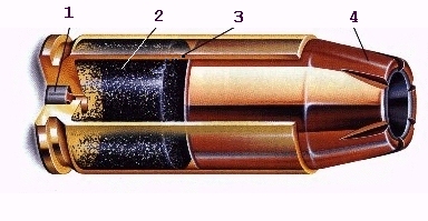 In dem linken Bild, ist (1) der Zünder (Zündhütchen), welcher vom Schlagbolzen getroffen wird, wenn jemand den Abzug der Waffe betätigt.